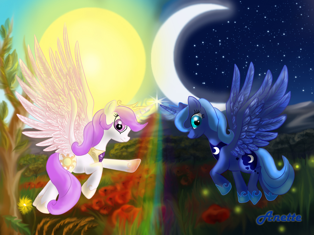 Потом дошло, что они равноправно похожи (ты же изобразила их, когда они были на одном уровне?); как я понимаю, Селестия раньше апгрейд получила (в виде роста и гривы-авроры)? Рада, что понравились)