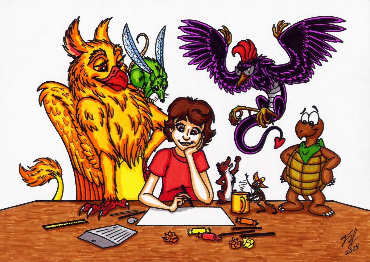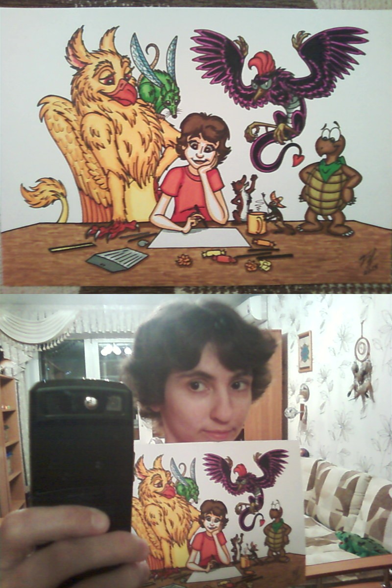 Рисовалось на конкурс в ВК, за призом не гонюсь, ибо у меня как раз такое уже есть, но тема меня заинтересовала. Нарисовать себя со своим персонажем (или персонажами). Фанперсы не допускаются, вот почему на картинке нет миниша Сапи, все персонажи полностью мои. Слева направо: грифоница Голди-Гри, травогрыз Скрипун (из той же повести, что и Голди), Мистер Ласка и василиск Мрак (их прообразы впервые выписаны в моей сказке "Василиск"), таракан Кукарача и черепах(а) Торт. Про последних двух пока ничего не сочиняла, не рисовала, и они почти никому не известны, но парочка мне очень нравится, так что пущай будут. По правилам требовалась фотка себя с рисунком, так что потом отсканирую нормально.