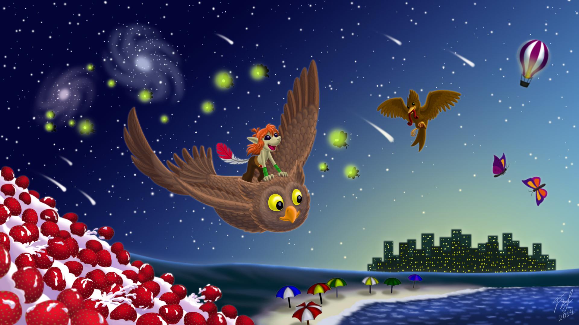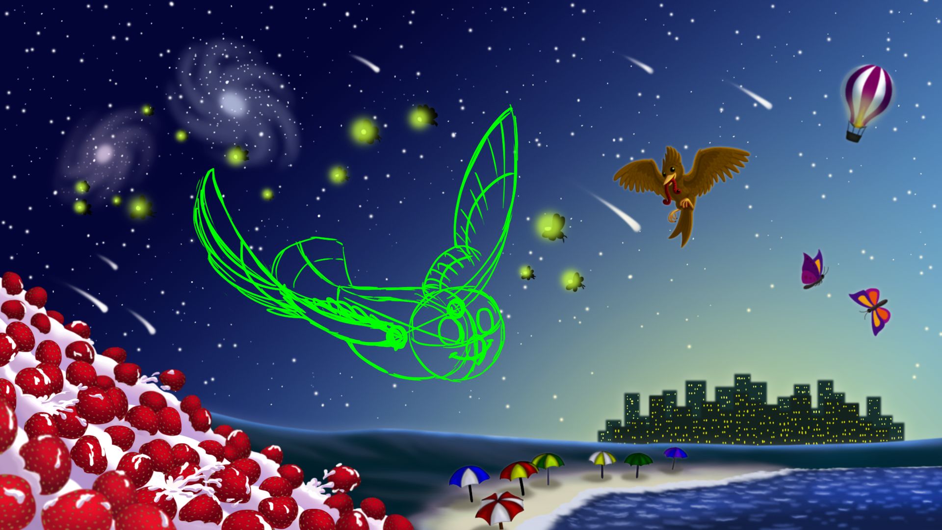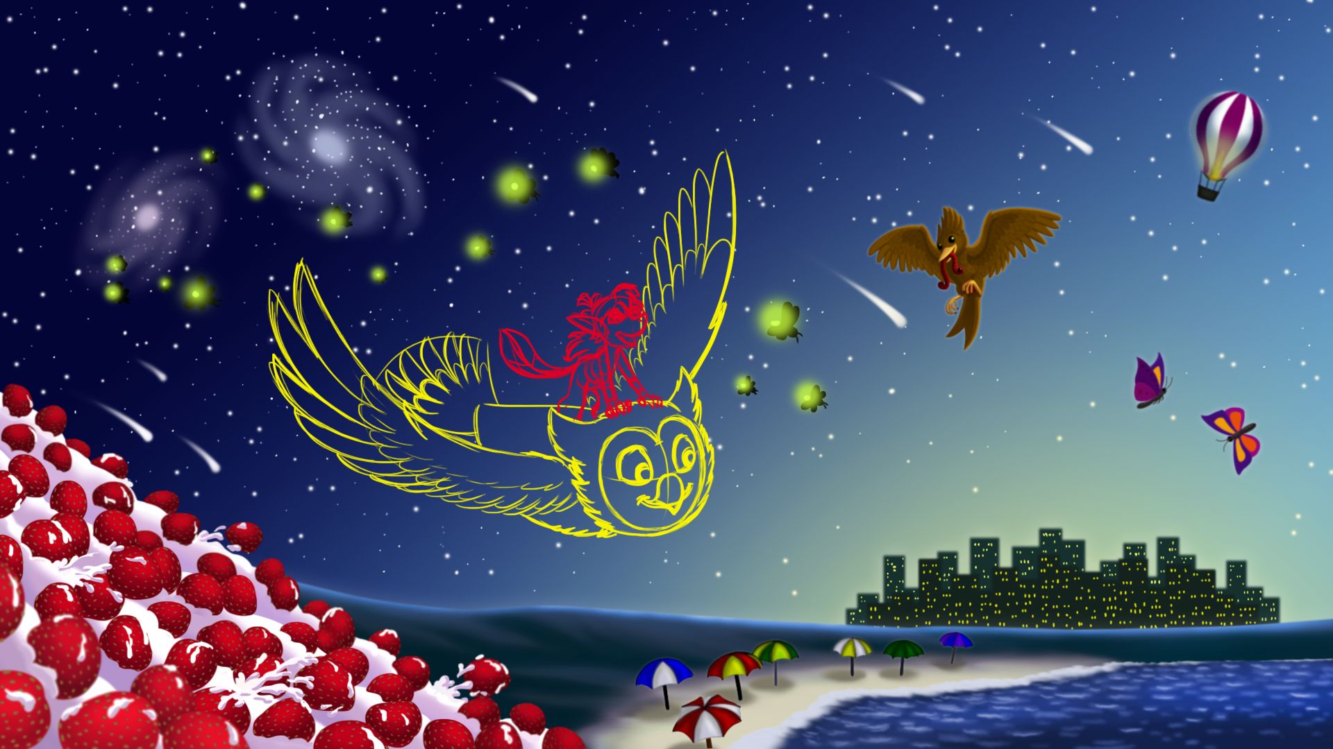 Owl City. Почти все детали рисунка - отсылки к названиям песен этого проекта (Галактики, Метеоритный дождь, Светлячки, Воздушный шар, Птичка и червяк, На крыльях бабочки, Клубничная лавина, Пляж с зонтиками). Сова и город - намёк на название самого проекта, остальное - названия песен.