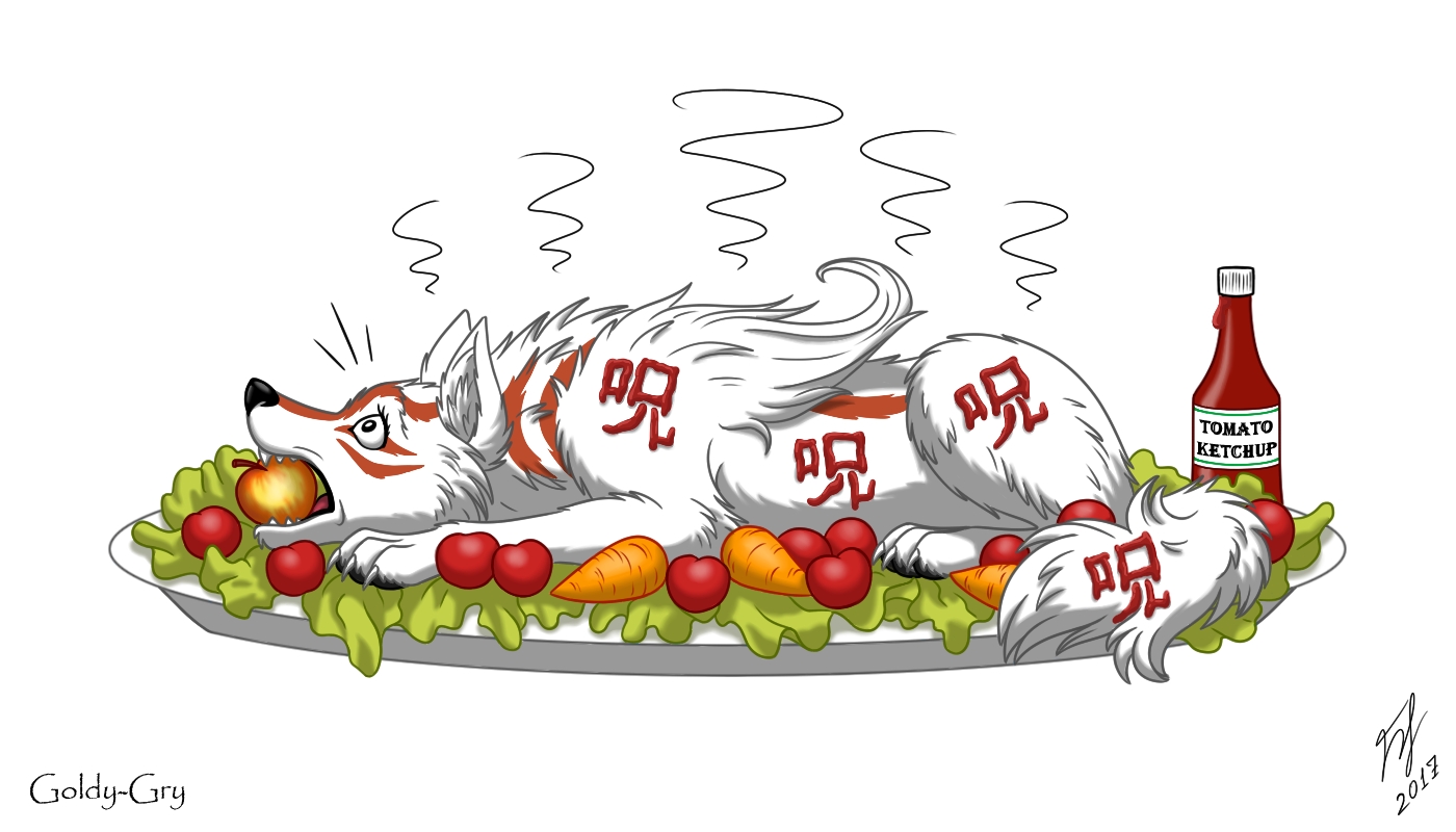 Я точно не знаю, но заказчик сказал, что в игре эти иероглифы означают проклятие. Грубо говоря, нанесённые на эту волчицу иероглифы удерживают её на месте, без верёвок и прочего.