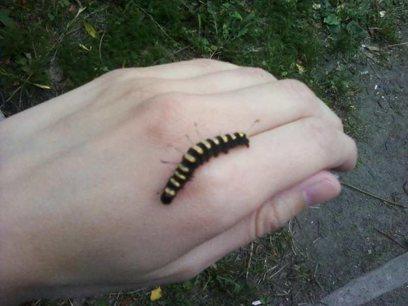 Гусеницу сфоткала чисто для опознания у энтомологов (стало интересно, что за бабочка из такой выведется). Ну и стрекозку просто подобрала едва живую. Люблю держать в руках насекомых. |