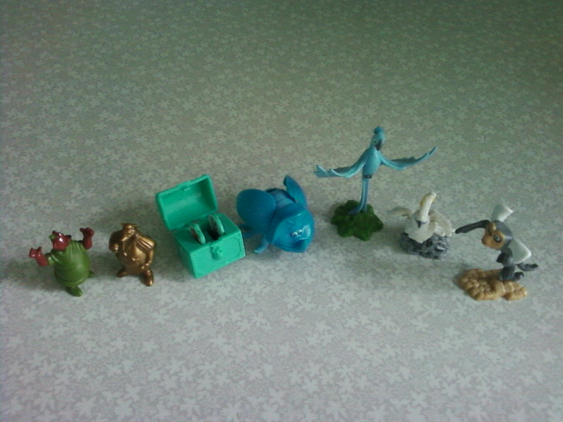 И по прочим мультам - Крошка Джон и Шериф из старого диснеевского "Робин Гуда" (у Шерифа внизу, простите, дыра - на карандаш или ручку можно надевать фигурку)), сундучок с парой плоских котят из тоже диснеевских "Аристокотов", жук-носорог (не помню имени) из диснеевского-пиксаровского "Приключения Флика" (или "Жизнь жуков"), и 3 фигурки из "Рио" - Жемчужинка, Найджел и одна мармазетка (игрунка или мартышка). Если кому что надо - прошу в личку. |