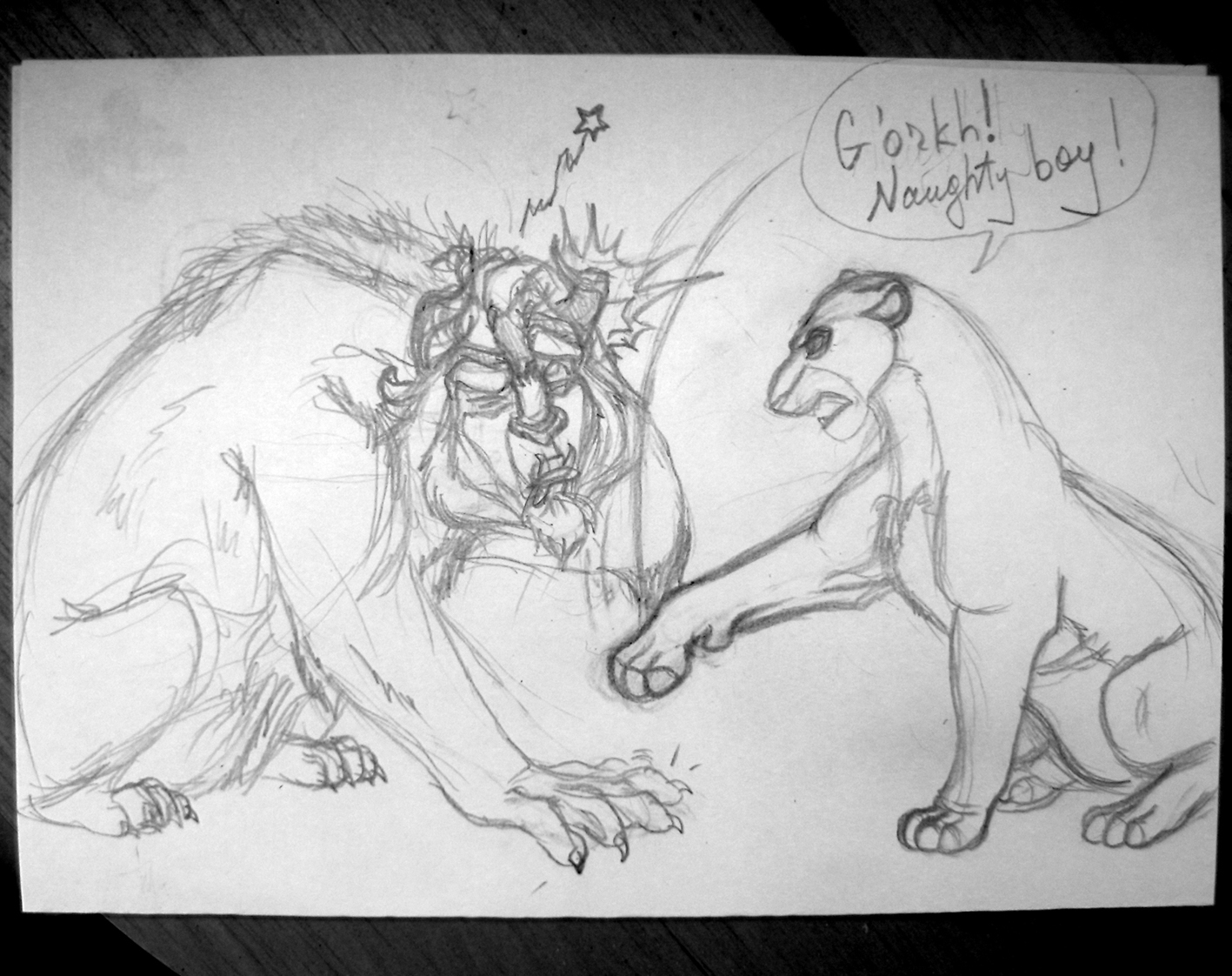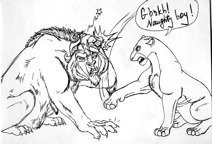 злой тёть писала: в смысле, карандашное? Именно. Чем ты обводила? Обводка немного неаккуратная, а в некоторых местах слишком простая и персонажи отличаются рисовкой - Сараби выглядит "голой", ей не хватает небольших торчащих шерстинок тут и там. Пузо у неё очень торчит вперёд и непонятно, что там за шерстяной комок на груди. Ещё какие-то странные складки на движущейся лапе и сама лапа выглядит как крыло летучей мыши. И тело у неё слишком массивное по сравнению с задними лапами. Что-то я начала критиковать, хотя ты не просила... Надеюсь не обидела :) |